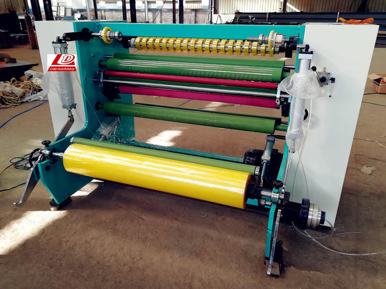 This LD-1300A adhesive bopp tape slitting machine includes four parts: Slitting machine, core loader, core cutter and rewinder